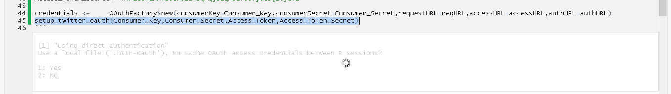 api_key <- "YOUR API KEY" api_secret <- "YOUR API SECRET" access_token <- "YOUR ACCESS TOKEN" access_token_secret <- "YOUR ACCESS TOKEN SECRET" setup_twitter_oauth(api_key,api_secret) |